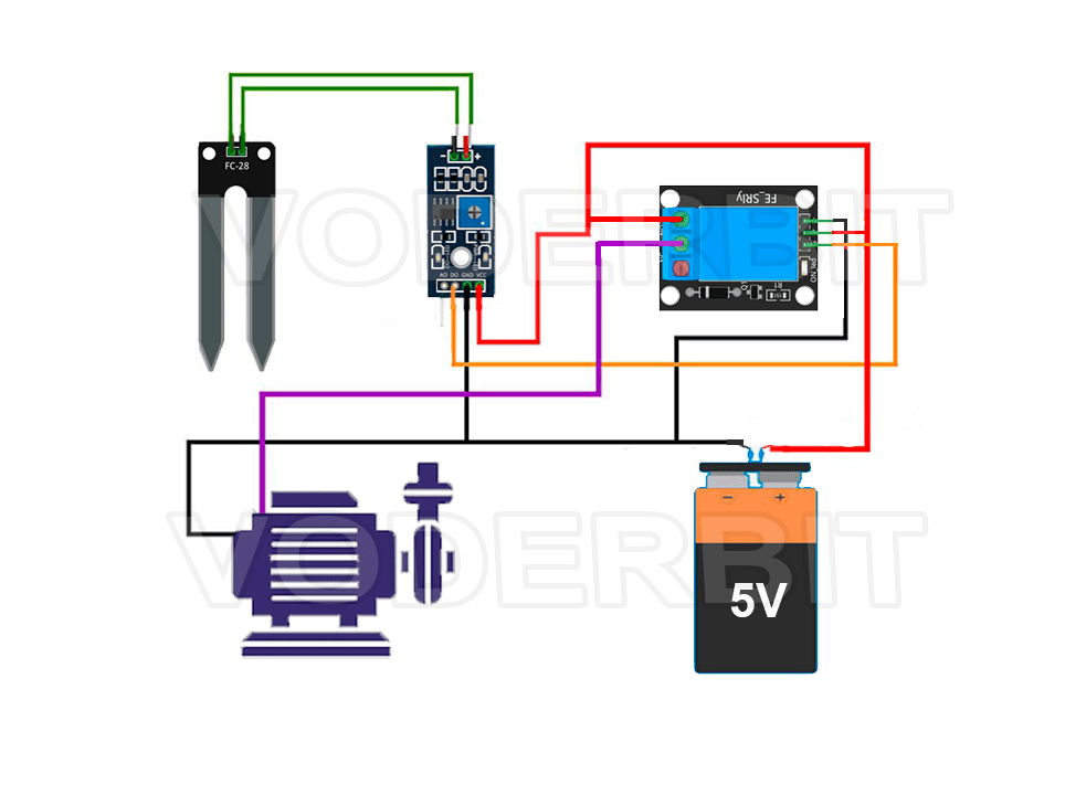 - Función Aislante: El relé utiliza un electroimán para accionar un interruptor mecánico. Esto proporciona un aislamiento galvánico completo entre el circuito de control (sensor y relé VCC/GND) y el circuito de la bomba. Aunque en este proyecto ambos circuitos comparten 5V, este aislamiento es una práctica de ingeniería fundamental que protege los componentes sensibles.