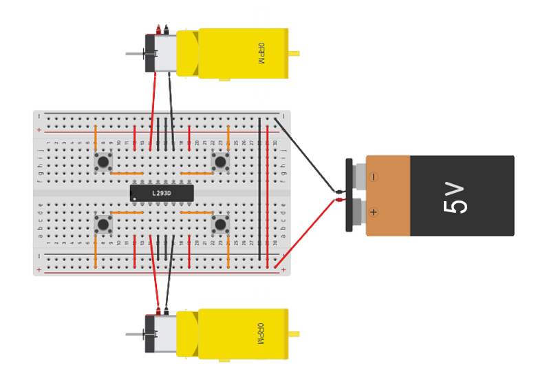 Para este proyecto desarrollaremos un sistema que permita controlar el sentido de giro de dos motores utilizando el circuito integrado L293D y cuatro botones, sin necesidad de un microcontrolador. El circuito permitirá manejar el sentido de giro de los motores mediante los cuatro botones: dos para controlar el primer motor (uno para girar hacia adelante y otro hacia atrás) y dos para el segundo motor, con la misma funcionalidad.